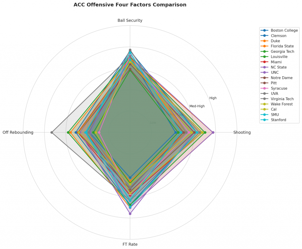 Figure 2: Offensive Four Factors comparison across ACC teams. The radar chart shows each team’s shooting efficiency (eFG%), ball security (TOV%), offensive rebounding (OREB%), and free throw generation (FT Rate).
