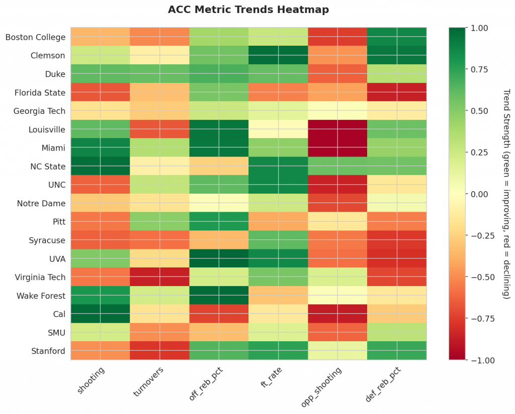 - Trending Down (Efficiency): Boston College, Florida State, Georgia Tech, UNC, Notre Dame