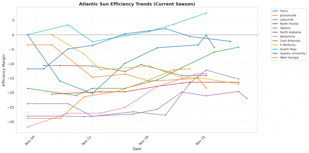 Figure 1: Efficiency margin trends for Atlantic Sun teams throughout the season. Teams trending upward show improving performance, while downward trends indicate struggles.