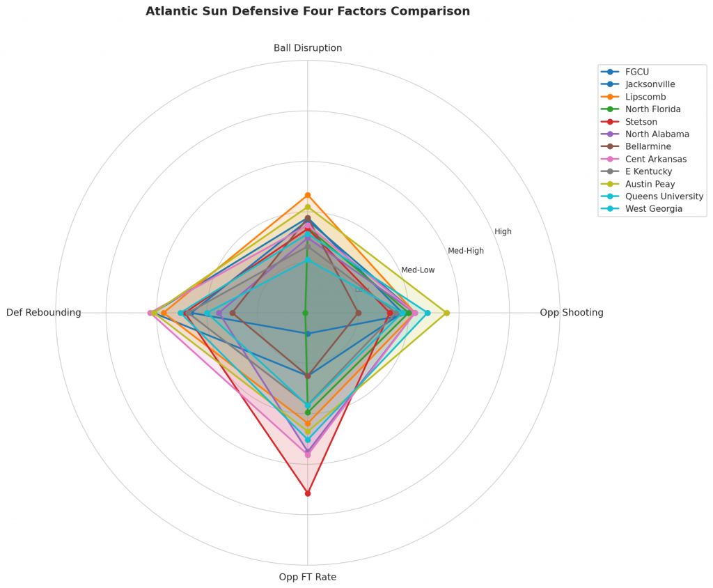 Figure 3: Defensive Four Factors comparison across Atlantic Sun teams. The radar chart shows each team’s opponent shooting defense (Opp eFG%), ball disruption (forcing TOV%), defensive rebounding (DREB%), and opponent free throw prevention (Opp FT Rate).