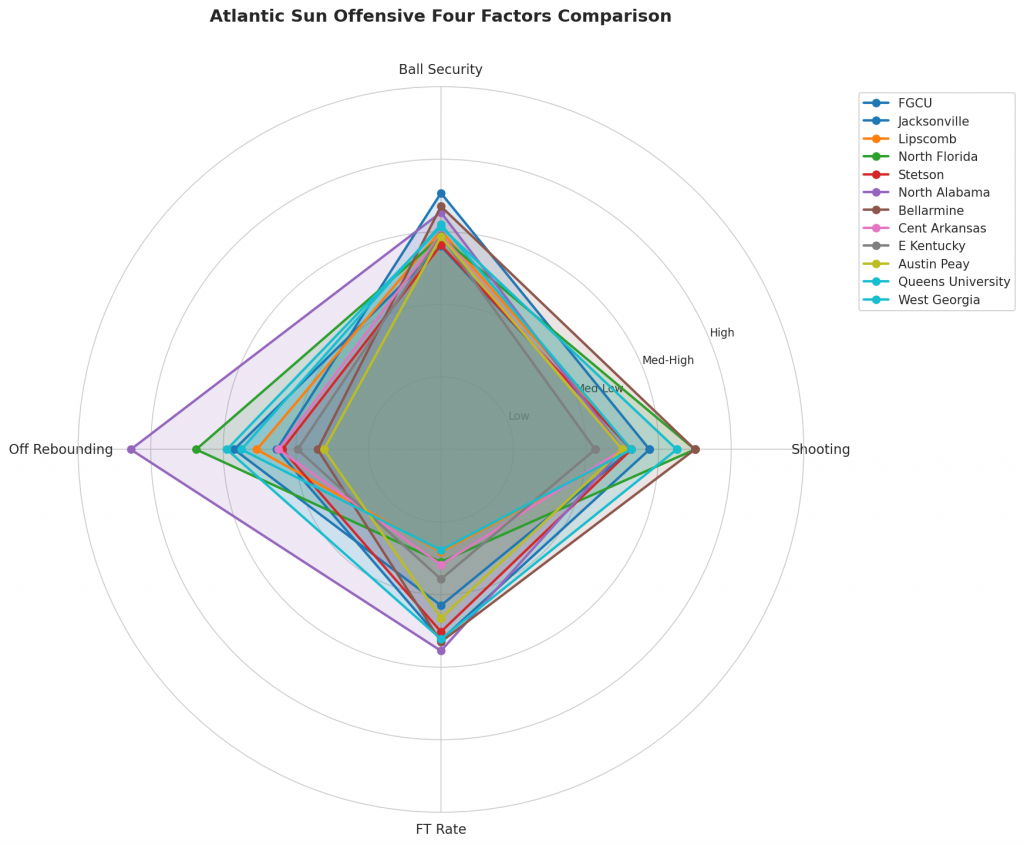 Figure 2: Offensive Four Factors comparison across Atlantic Sun teams. The radar chart shows each team’s shooting efficiency (eFG%), ball security (TOV%), offensive rebounding (OREB%), and free throw generation (FT Rate).