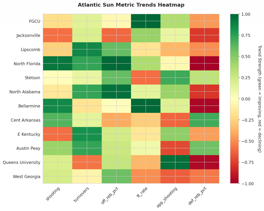 - Trending Down (Efficiency): FGCU, Jacksonville, Lipscomb, Stetson, North Alabama
