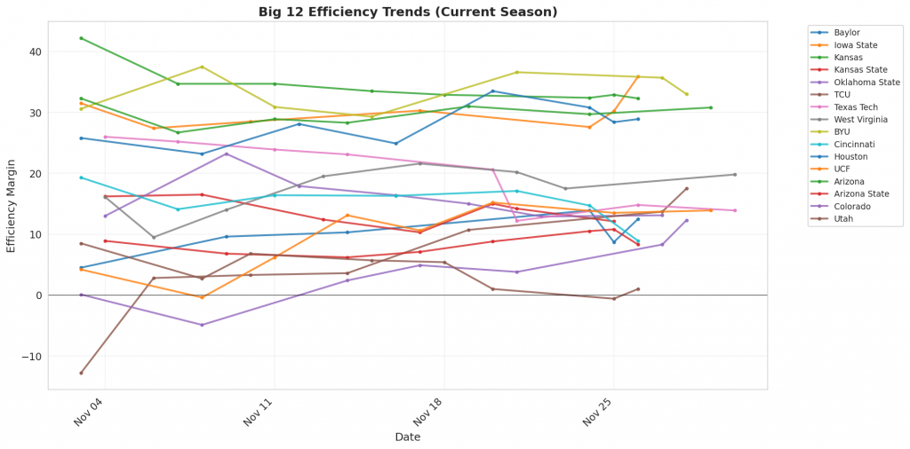 Figure 1: Efficiency margin trends for Big 12 teams throughout the season. Teams trending upward show improving performance, while downward trends indicate struggles.