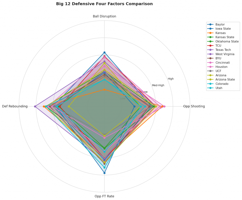 Figure 3: Defensive Four Factors comparison across Big 12 teams. The radar chart shows each team’s opponent shooting defense (Opp eFG%), ball disruption (forcing TOV%), defensive rebounding (DREB%), and opponent free throw prevention (Opp FT Rate).