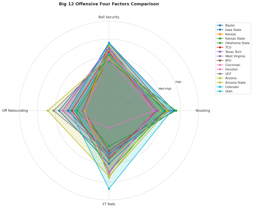 Figure 2: Offensive Four Factors comparison across Big 12 teams. The radar chart shows each team’s shooting efficiency (eFG%), ball security (TOV%), offensive rebounding (OREB%), and free throw generation (FT Rate).