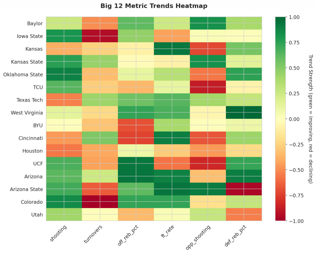 - Trending Up (Efficiency): Baylor, Iowa State, Kansas State, Oklahoma State, TCU