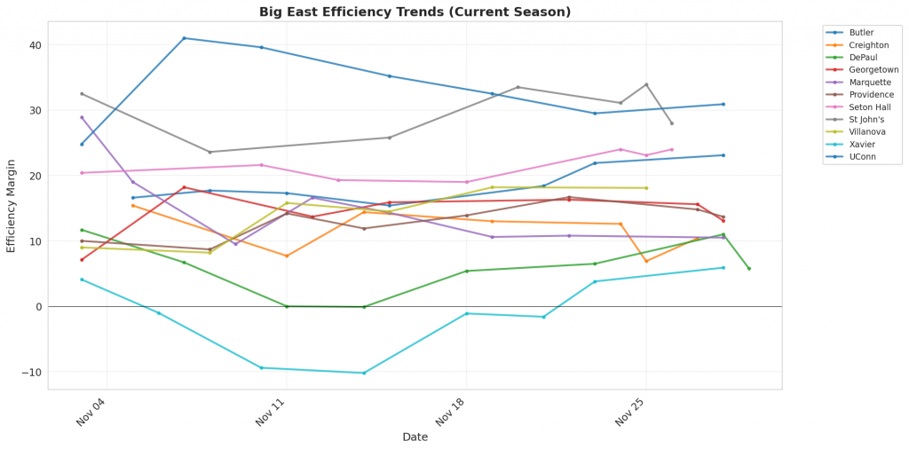 Figure 1: Efficiency margin trends for Big East teams throughout the season. Teams trending upward show improving performance, while downward trends indicate struggles.