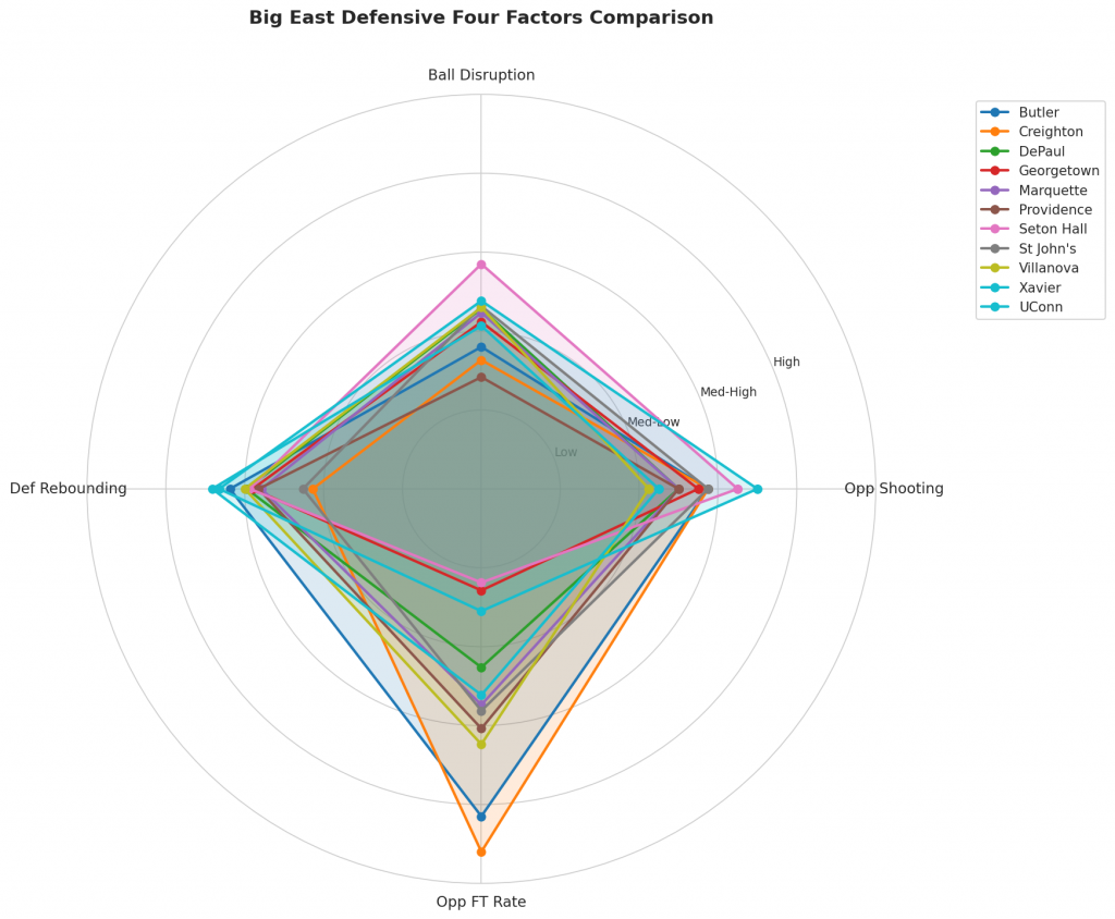 Figure 3: Defensive Four Factors comparison across Big East teams. The radar chart shows each team’s opponent shooting defense (Opp eFG%), ball disruption (forcing TOV%), defensive rebounding (DREB%), and opponent free throw prevention (Opp FT Rate).