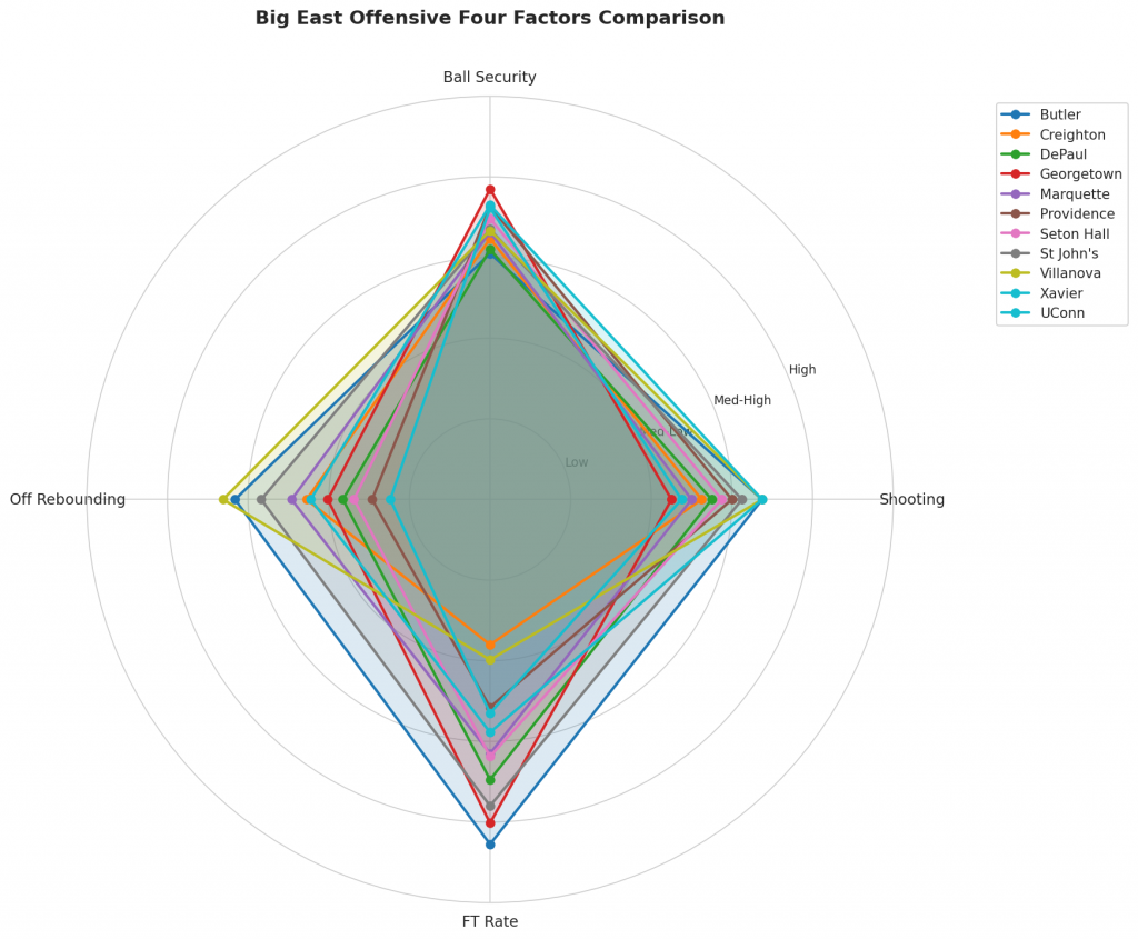 Figure 2: Offensive Four Factors comparison across Big East teams. The radar chart shows each team’s shooting efficiency (eFG%), ball security (TOV%), offensive rebounding (OREB%), and free throw generation (FT Rate).