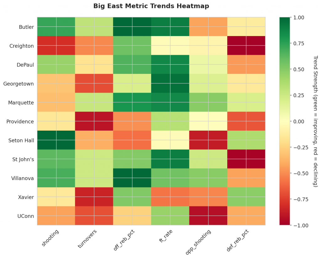 - Trending Down (Efficiency): Creighton, Georgetown, Marquette, Providence, Xavier