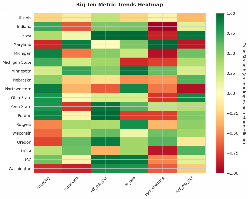 - Trending Up (Efficiency): Indiana, Iowa, Michigan, Michigan State, Minnesota