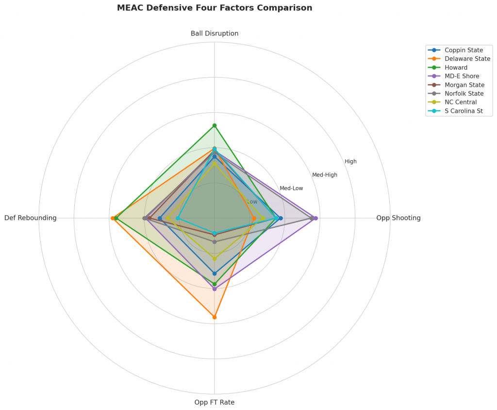 Figure 3: Defensive Four Factors comparison across MEAC teams. The radar chart shows each team’s opponent shooting defense (Opp eFG%), ball disruption (forcing TOV%), defensive rebounding (DREB%), and opponent free throw prevention (Opp FT Rate).