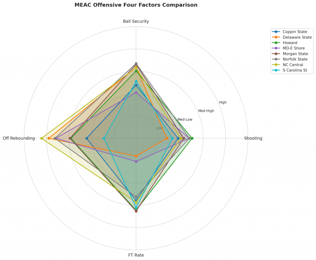 Figure 2: Offensive Four Factors comparison across MEAC teams. The radar chart shows each team’s shooting efficiency (eFG%), ball security (TOV%), offensive rebounding (OREB%), and free throw generation (FT Rate).
