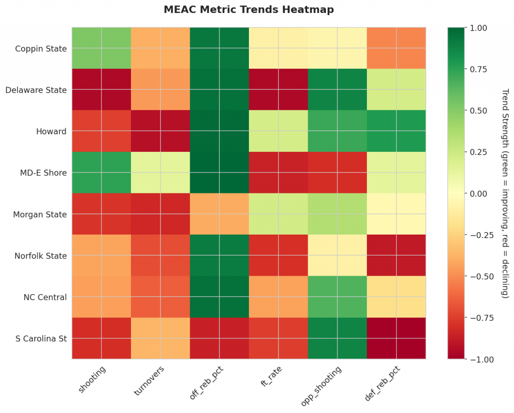 - Trending Down (Efficiency): Delaware State, Howard, Morgan State, Norfolk State, NC Central