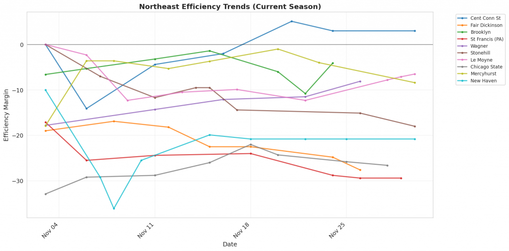 Figure 1: Efficiency margin trends for Northeast teams throughout the season. Teams trending upward show improving performance, while downward trends indicate struggles.