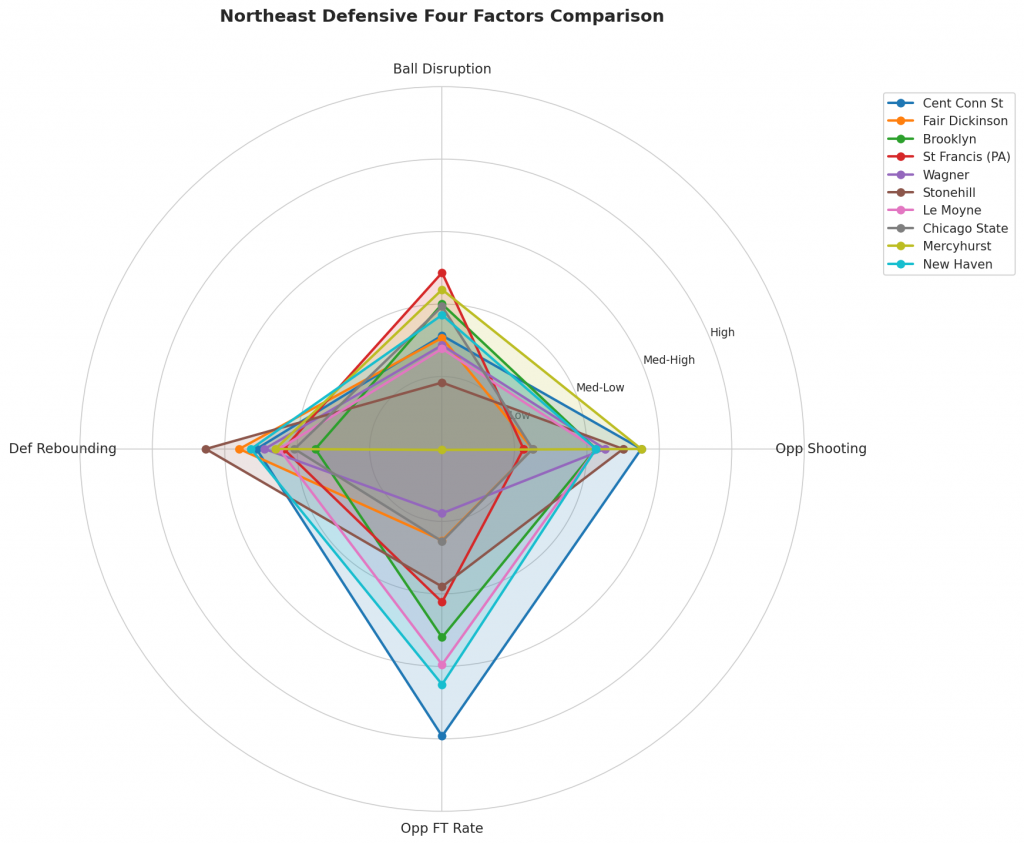 Figure 3: Defensive Four Factors comparison across Northeast teams. The radar chart shows each team’s opponent shooting defense (Opp eFG%), ball disruption (forcing TOV%), defensive rebounding (DREB%), and opponent free throw prevention (Opp FT Rate).