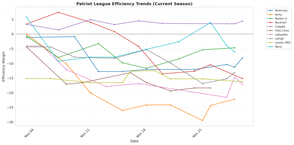 Figure 1: Efficiency margin trends for Patriot League teams throughout the season. Teams trending upward show improving performance, while downward trends indicate struggles.