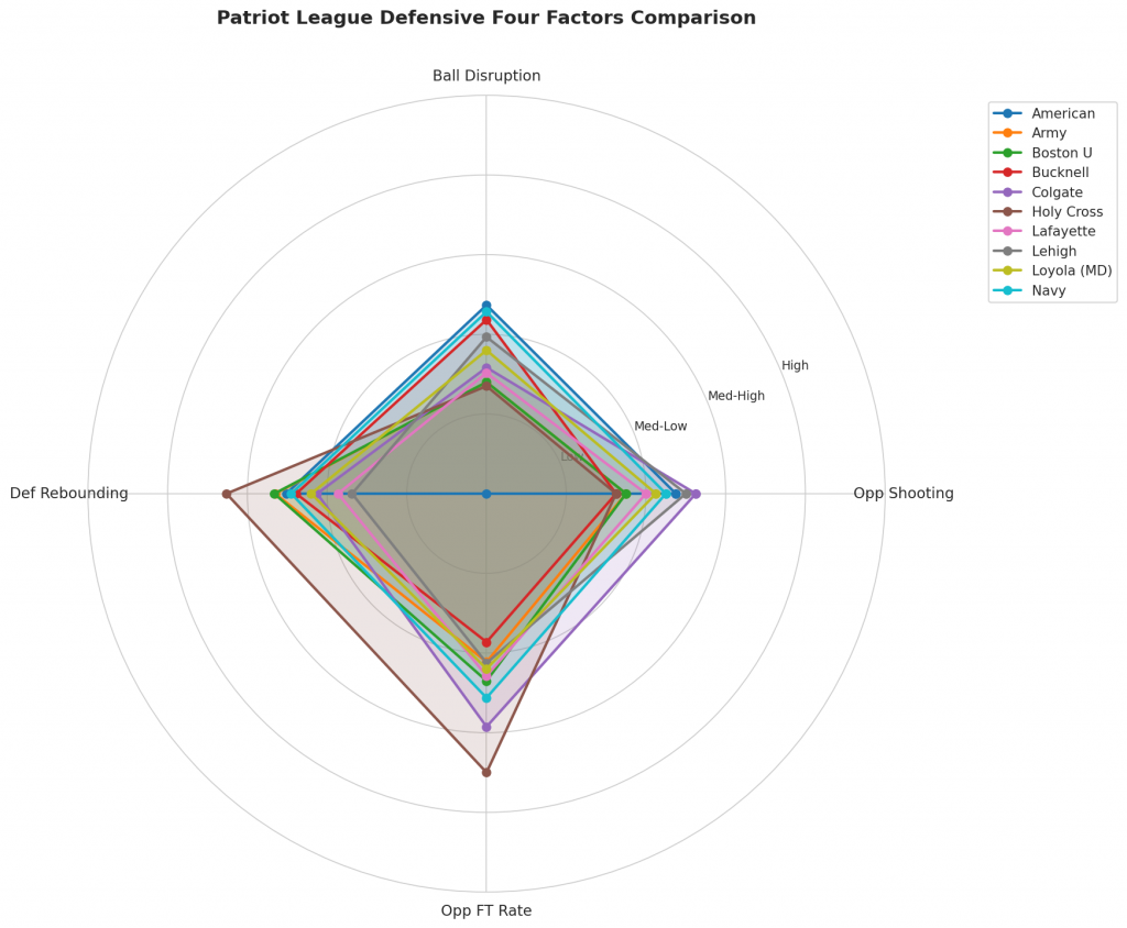 Figure 3: Defensive Four Factors comparison across Patriot League teams. The radar chart shows each team’s opponent shooting defense (Opp eFG%), ball disruption (forcing TOV%), defensive rebounding (DREB%), and opponent free throw prevention (Opp FT Rate).