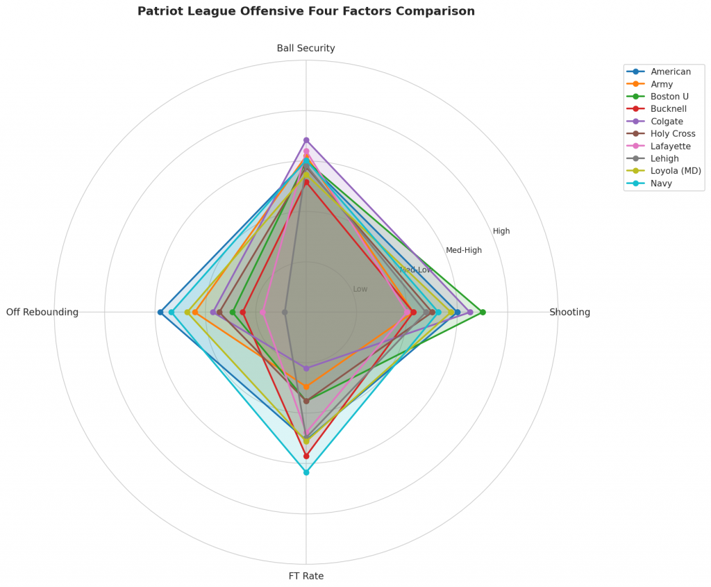 Figure 2: Offensive Four Factors comparison across Patriot League teams. The radar chart shows each team’s shooting efficiency (eFG%), ball security (TOV%), offensive rebounding (OREB%), and free throw generation (FT Rate).