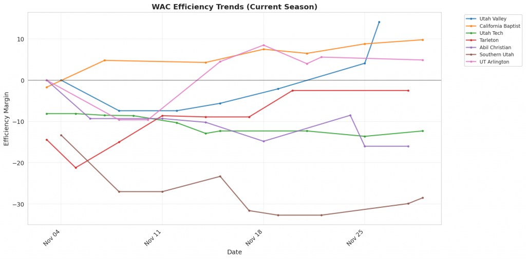 Figure 1: Efficiency margin trends for WAC teams throughout the season. Teams trending upward show improving performance, while downward trends indicate struggles.