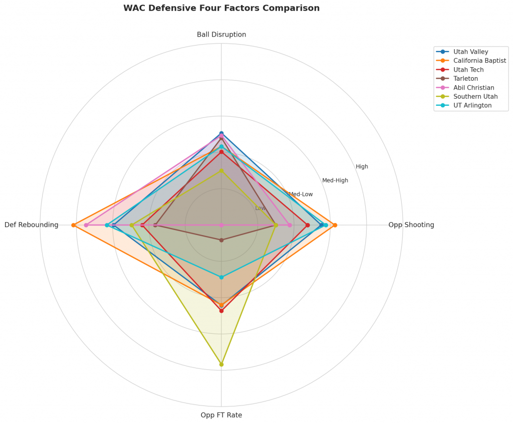 Figure 3: Defensive Four Factors comparison across WAC teams. The radar chart shows each team’s opponent shooting defense (Opp eFG%), ball disruption (forcing TOV%), defensive rebounding (DREB%), and opponent free throw prevention (Opp FT Rate).