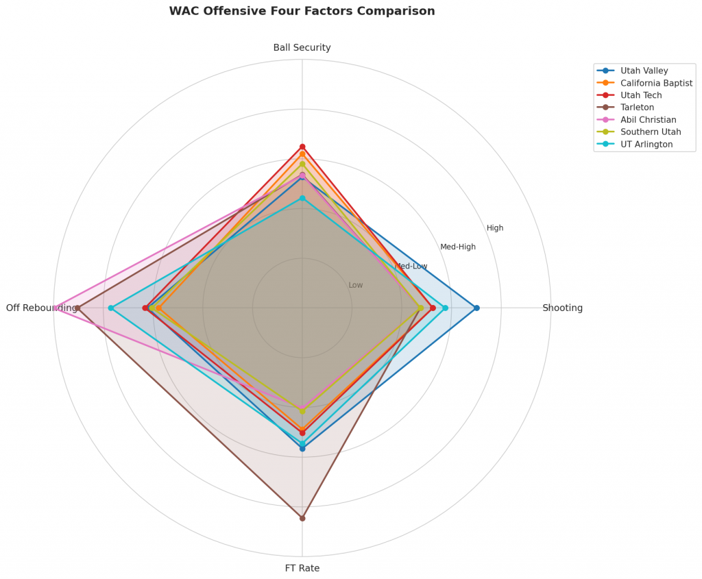 Figure 2: Offensive Four Factors comparison across WAC teams. The radar chart shows each team’s shooting efficiency (eFG%), ball security (TOV%), offensive rebounding (OREB%), and free throw generation (FT Rate).