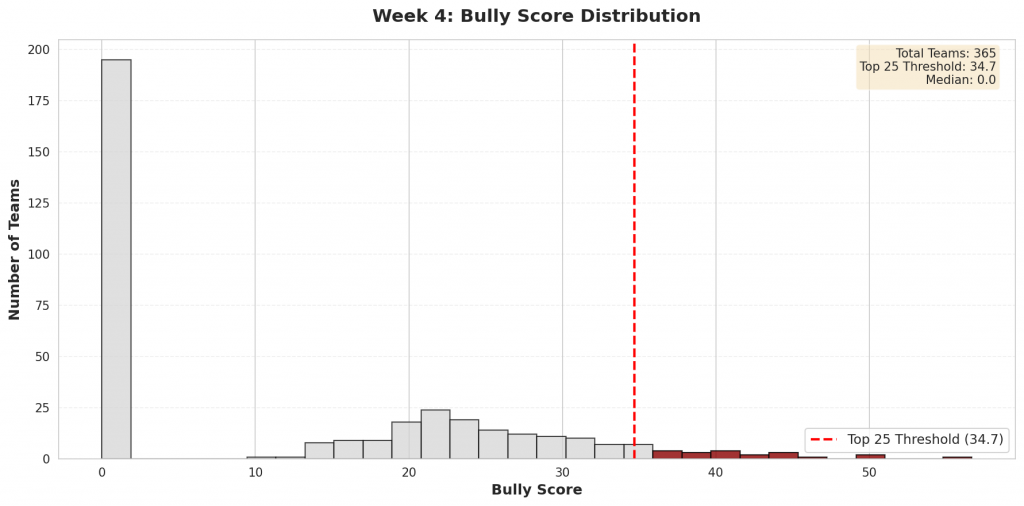 Figure 4: Distribution of bully scores across all Division I teams. The top 25 bullies (highlighted in red) represent teams whose efficiency metrics are most inflated by their performance patterns.