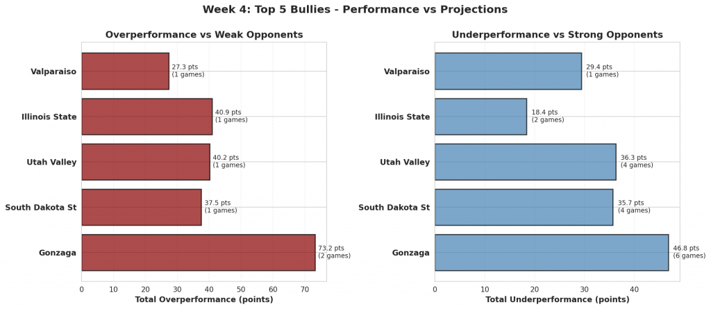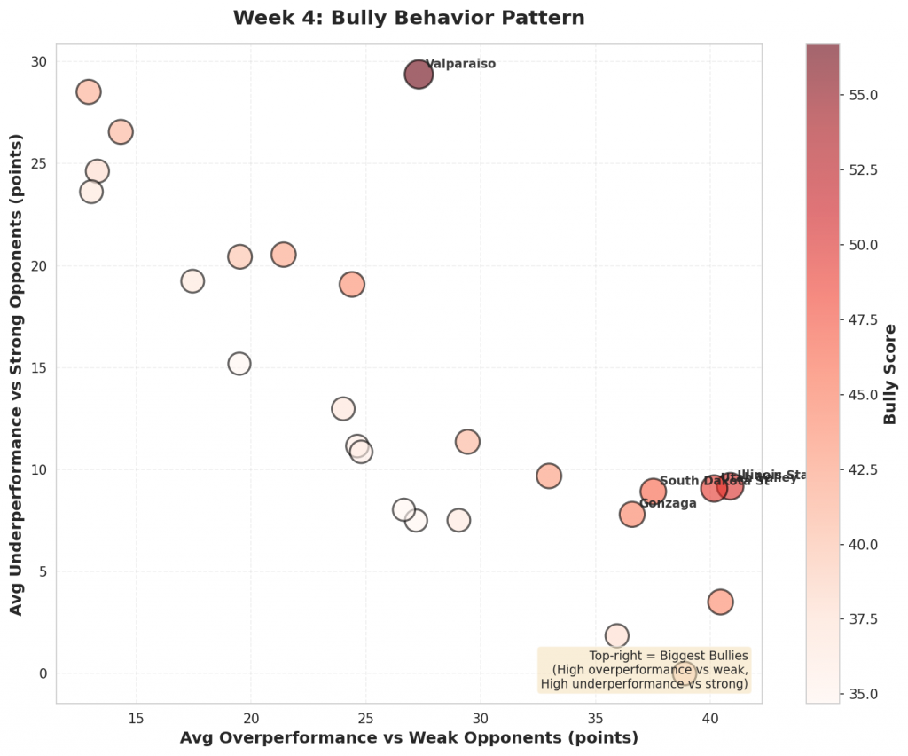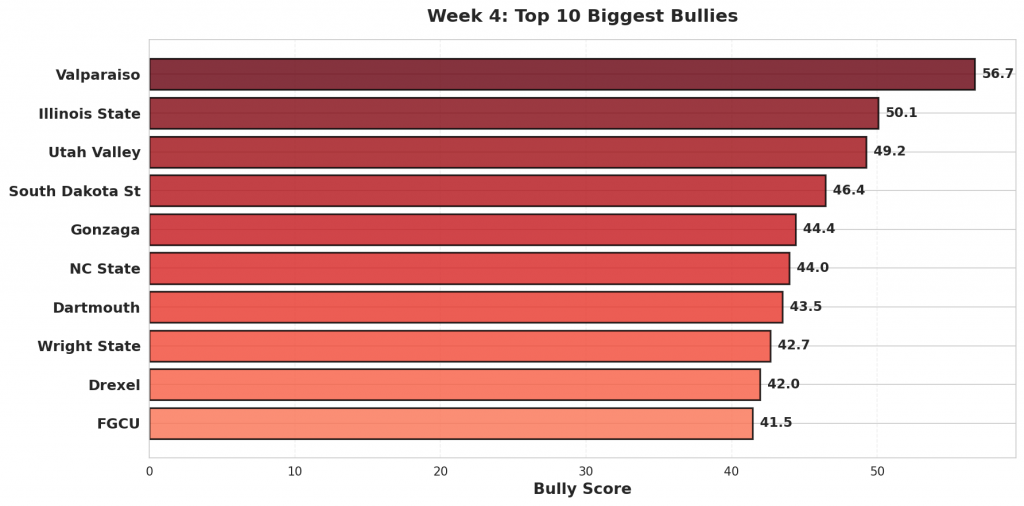 Figure 1: Top 10 teams with the highest bully scores in Week 4. Bully scores reflect the combination of overperformance against weak opponents and underperformance against quality competition.