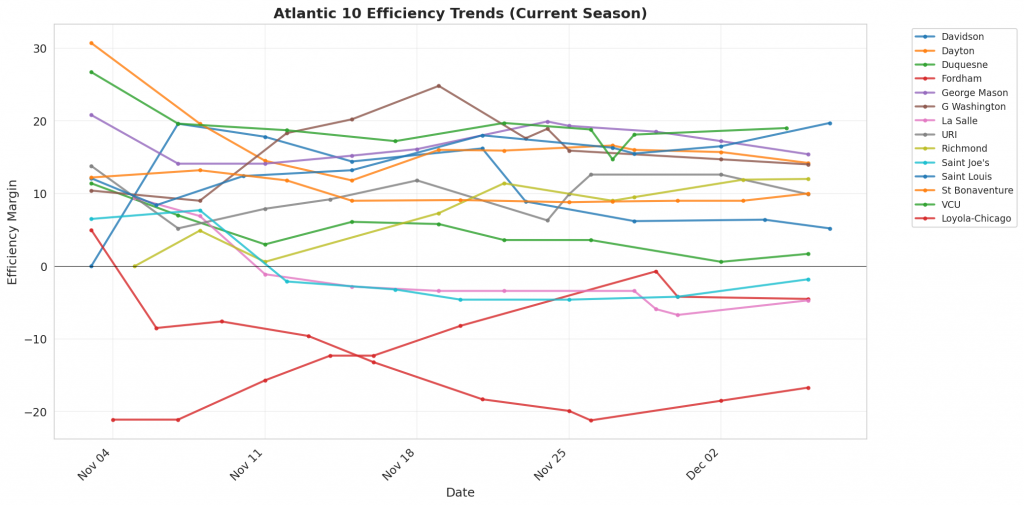 Figure 1: Efficiency margin trends for Atlantic 10 teams throughout the season. Teams trending upward show improving performance, while downward trends indicate struggles.