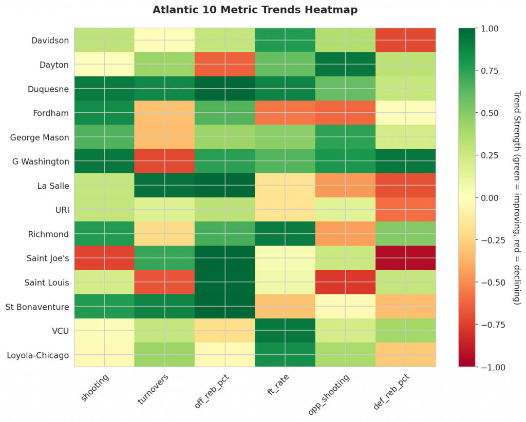 - Trending Up (Efficiency): Davidson, Dayton, Duquesne, Fordham, George Mason