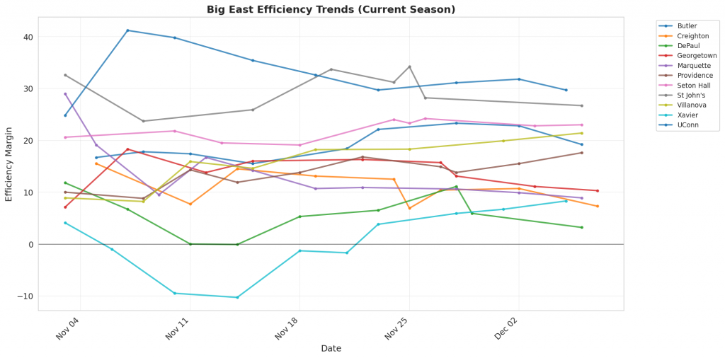 Figure 1: Efficiency margin trends for Big East teams throughout the season. Teams trending upward show improving performance, while downward trends indicate struggles.