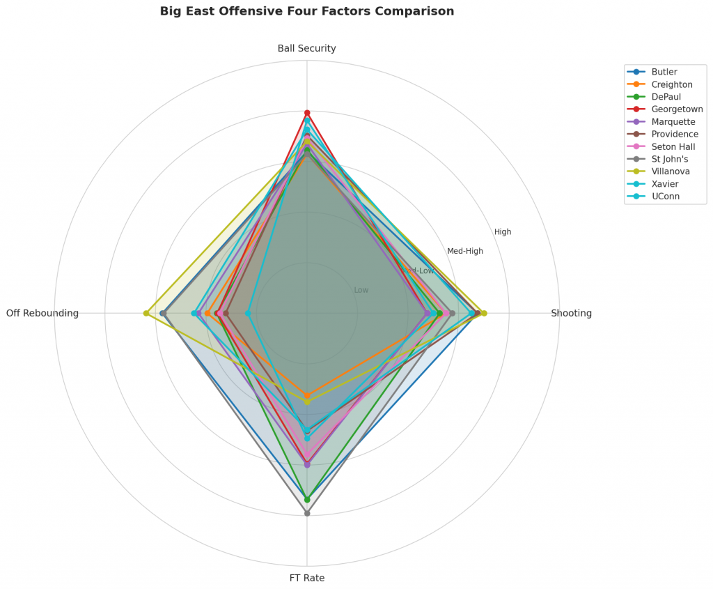 Figure 2: Offensive Four Factors comparison across Big East teams. The radar chart shows each team’s shooting efficiency (eFG%), ball security (TOV%), offensive rebounding (OREB%), and free throw generation (FT Rate).