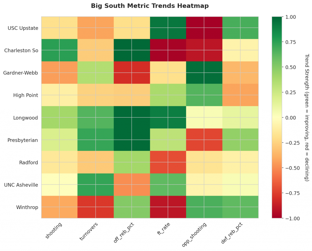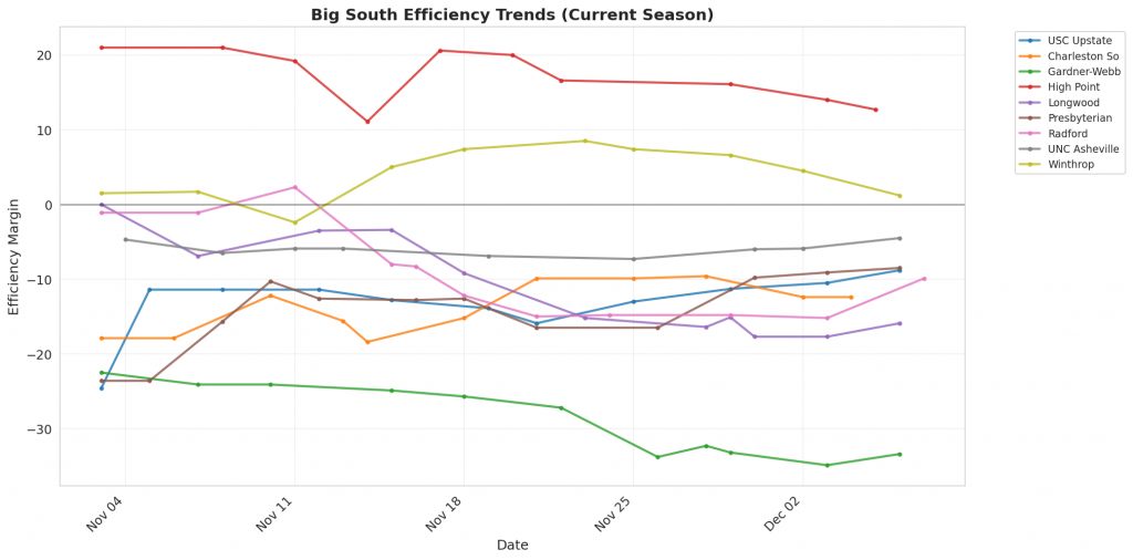 - Trending Down (Efficiency): USC Upstate, Gardner-Webb, High Point, Radford, Winthrop