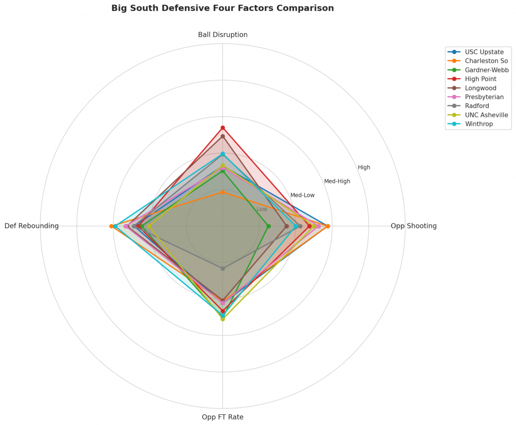 Figure 3: Defensive Four Factors comparison across Big South teams. The radar chart shows each team’s opponent shooting defense (Opp eFG%), ball disruption (forcing TOV%), defensive rebounding (DREB%), and opponent free throw prevention (Opp FT Rate).