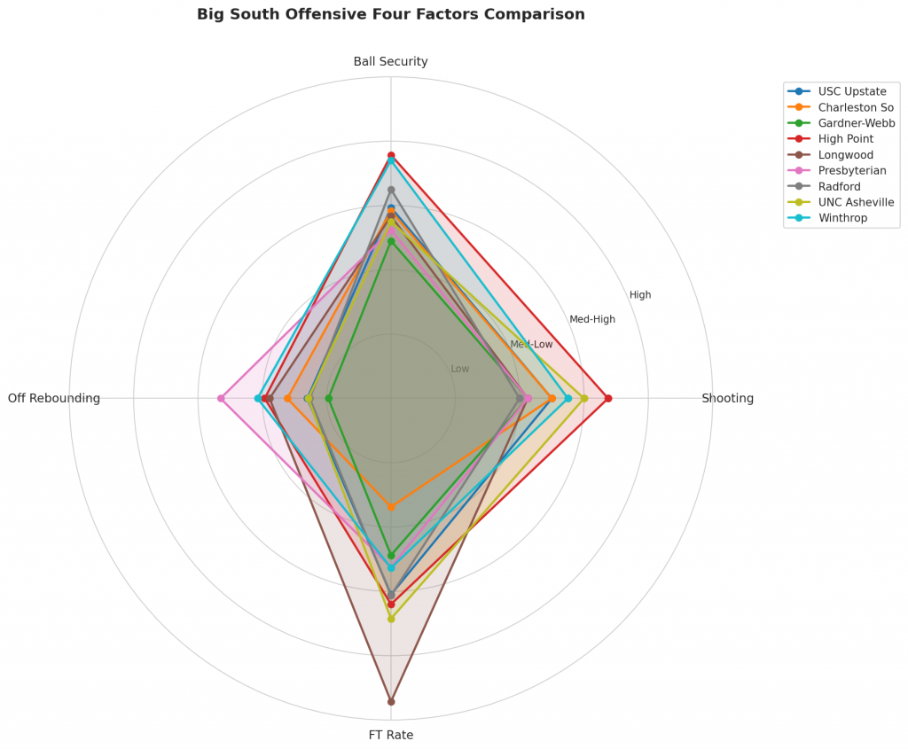 Figure 2: Offensive Four Factors comparison across Big South teams. The radar chart shows each team’s shooting efficiency (eFG%), ball security (TOV%), offensive rebounding (OREB%), and free throw generation (FT Rate).