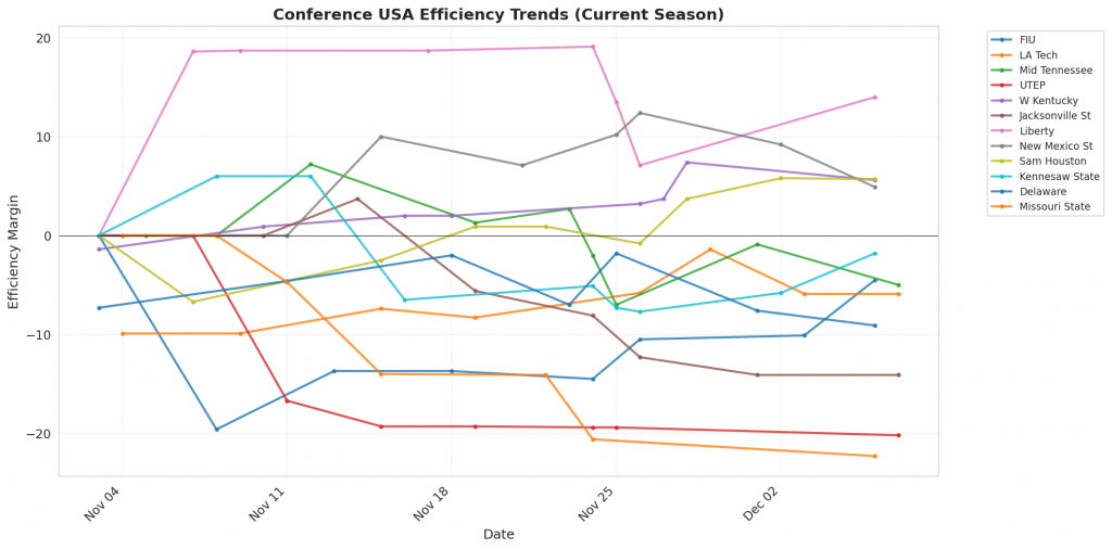Figure 1: Efficiency margin trends for Conference USA teams throughout the season. Teams trending upward show improving performance, while downward trends indicate struggles.