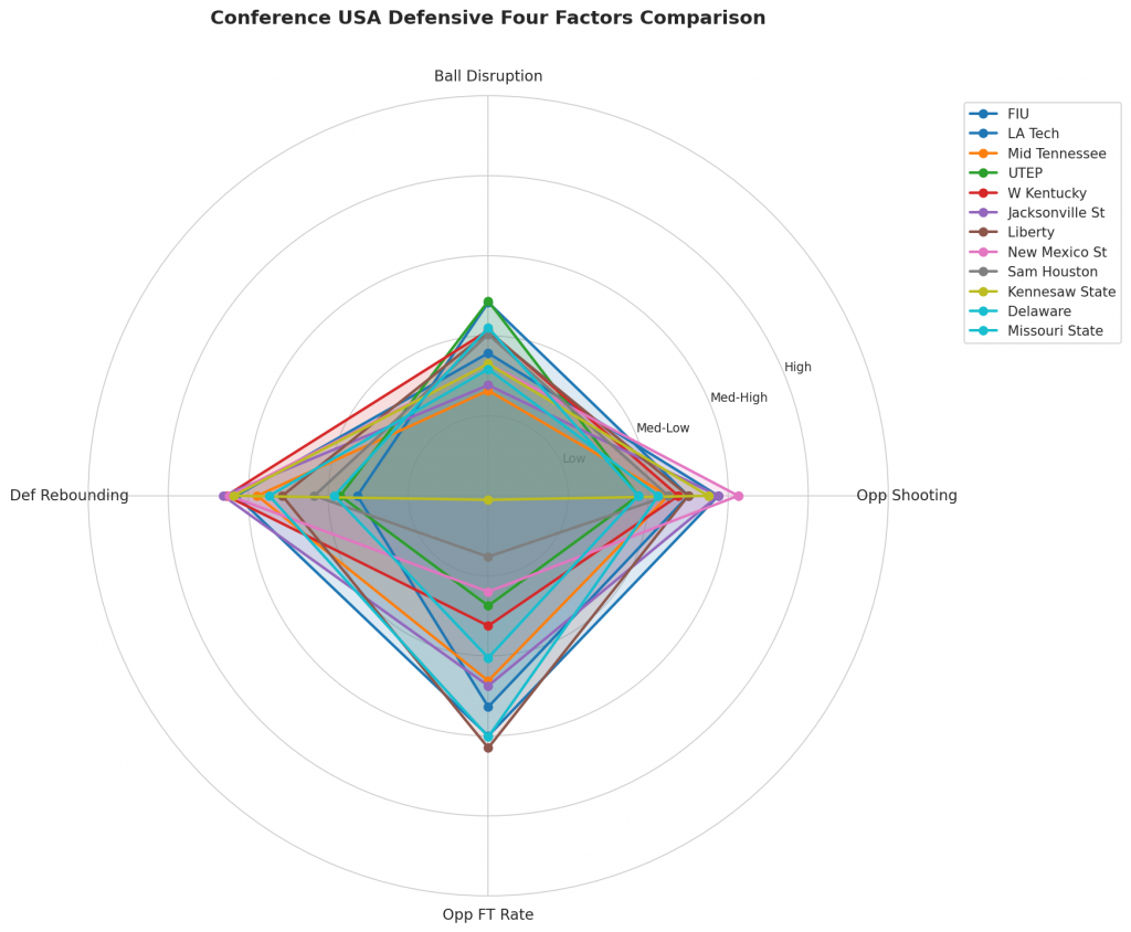 Figure 3: Defensive Four Factors comparison across Conference USA teams. The radar chart shows each team’s opponent shooting defense (Opp eFG%), ball disruption (forcing TOV%), defensive rebounding (DREB%), and opponent free throw prevention (Opp FT Rate).