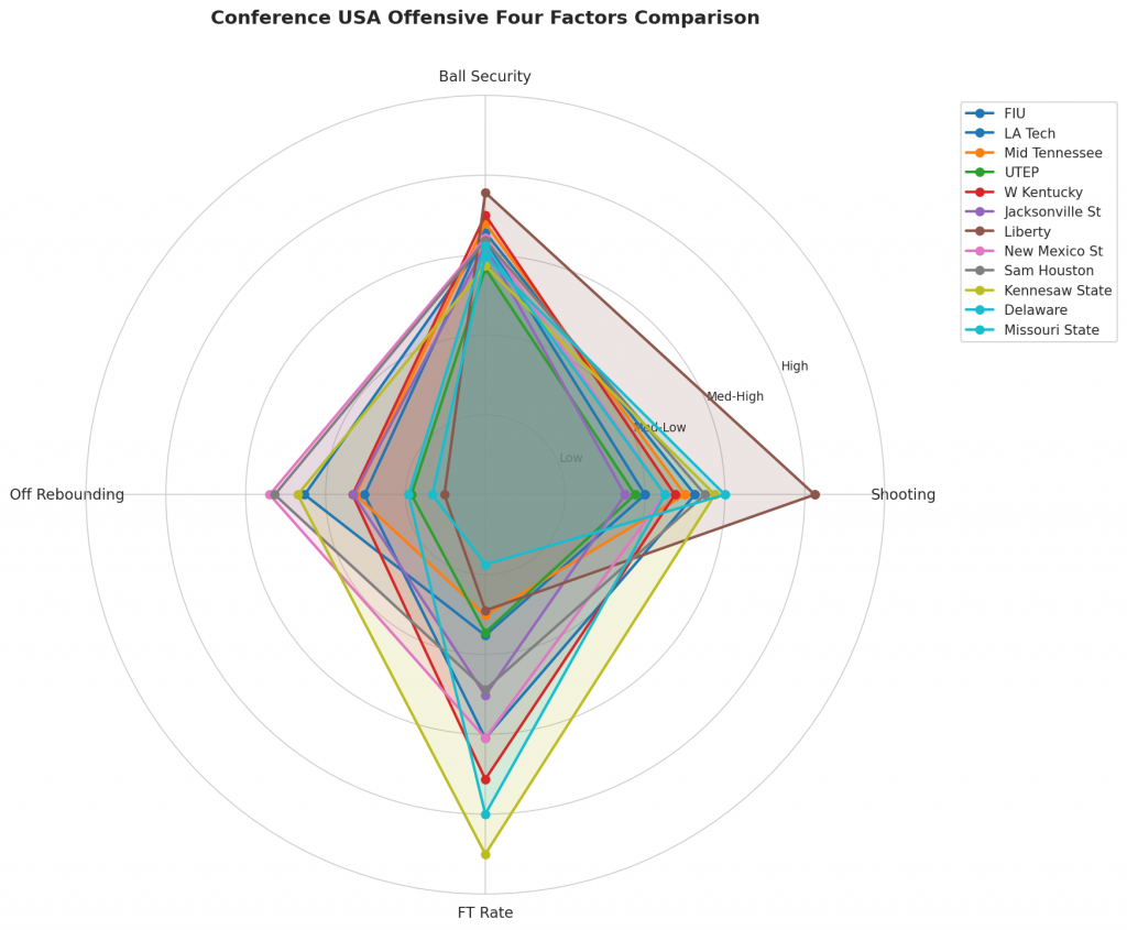 Figure 2: Offensive Four Factors comparison across Conference USA teams. The radar chart shows each team’s shooting efficiency (eFG%), ball security (TOV%), offensive rebounding (OREB%), and free throw generation (FT Rate).