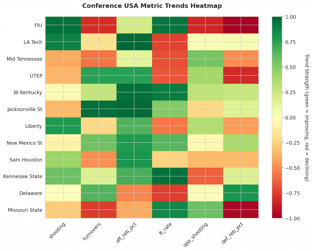 - Trending Up (Efficiency): FIU, LA Tech, Liberty, Sam Houston, Kennesaw State