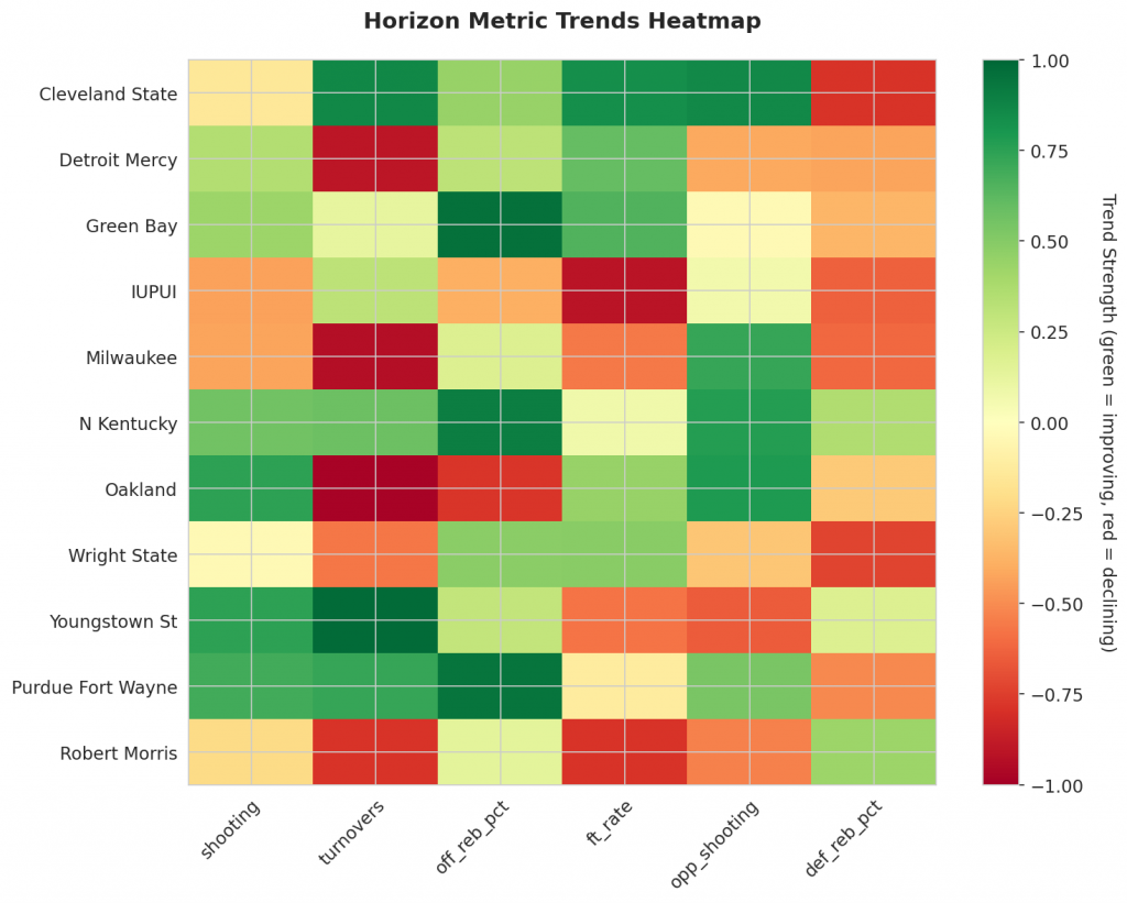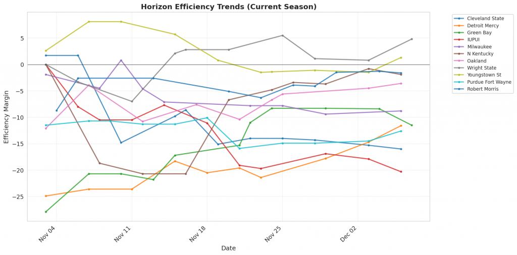 Figure 1: Efficiency margin trends for Horizon teams throughout the season. Teams trending upward show improving performance, while downward trends indicate struggles.