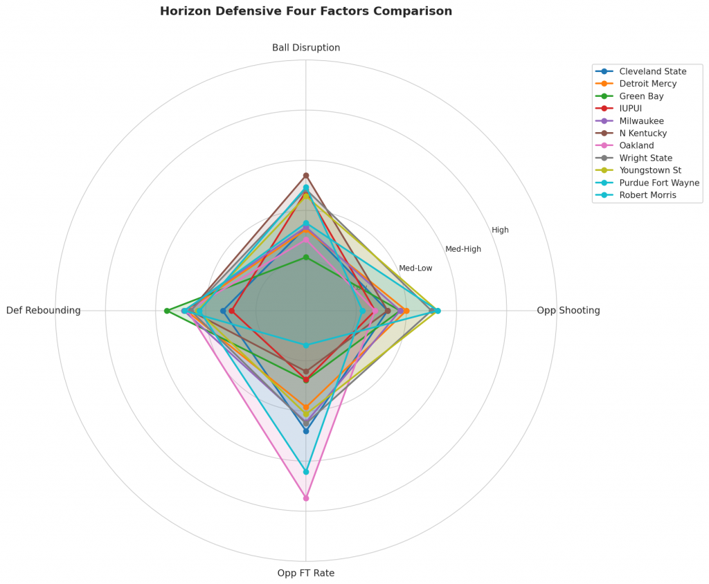 Figure 3: Defensive Four Factors comparison across Horizon teams. The radar chart shows each team’s opponent shooting defense (Opp eFG%), ball disruption (forcing TOV%), defensive rebounding (DREB%), and opponent free throw prevention (Opp FT Rate).