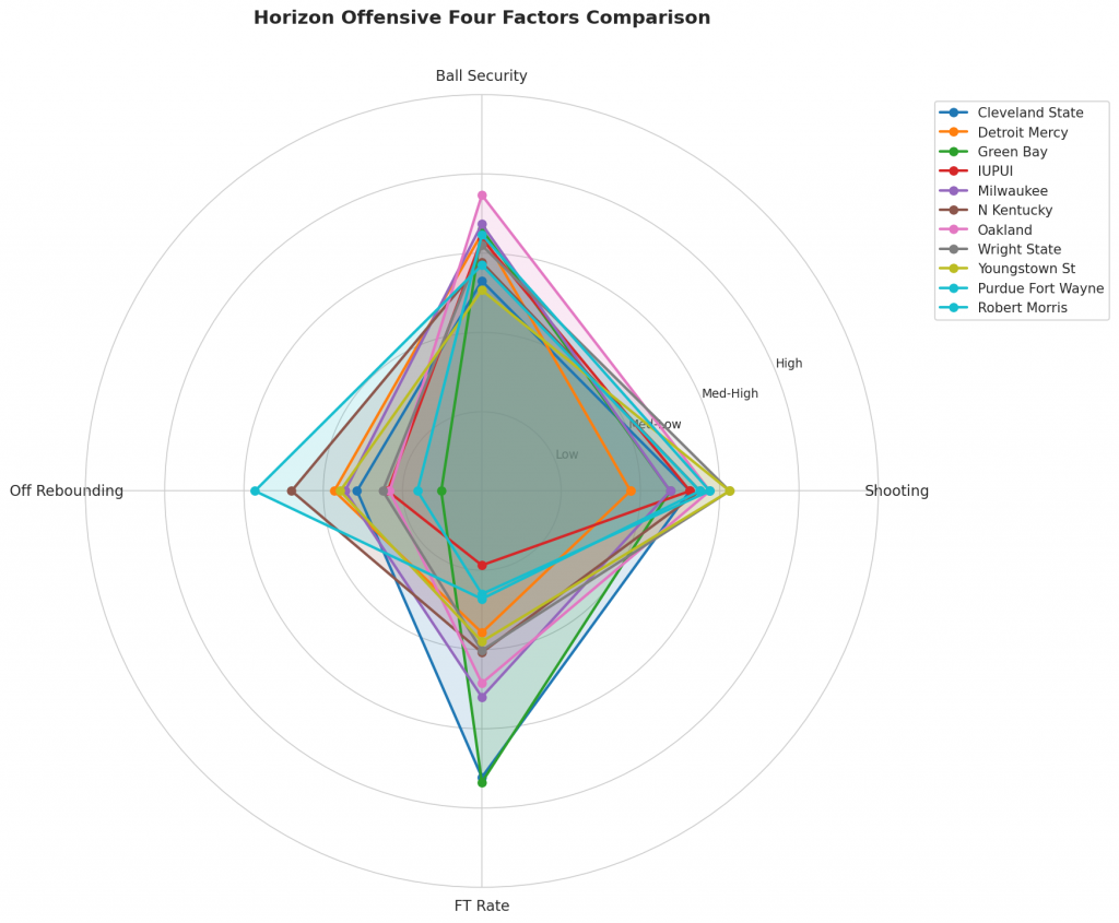 Figure 2: Offensive Four Factors comparison across Horizon teams. The radar chart shows each team’s shooting efficiency (eFG%), ball security (TOV%), offensive rebounding (OREB%), and free throw generation (FT Rate).