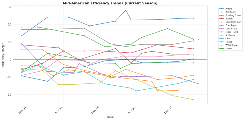 Figure 1: Efficiency margin trends for Mid-American teams throughout the season. Teams trending upward show improving performance, while downward trends indicate struggles.