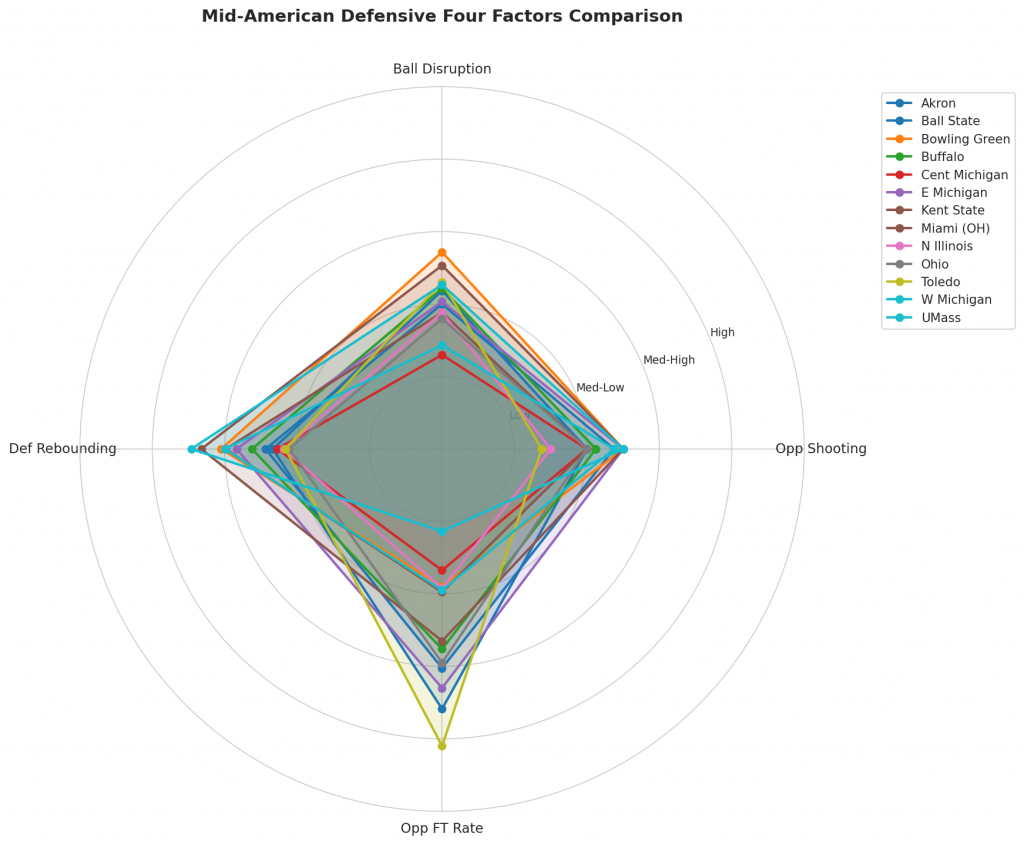 Figure 3: Defensive Four Factors comparison across Mid-American teams. The radar chart shows each team’s opponent shooting defense (Opp eFG%), ball disruption (forcing TOV%), defensive rebounding (DREB%), and opponent free throw prevention (Opp FT Rate).