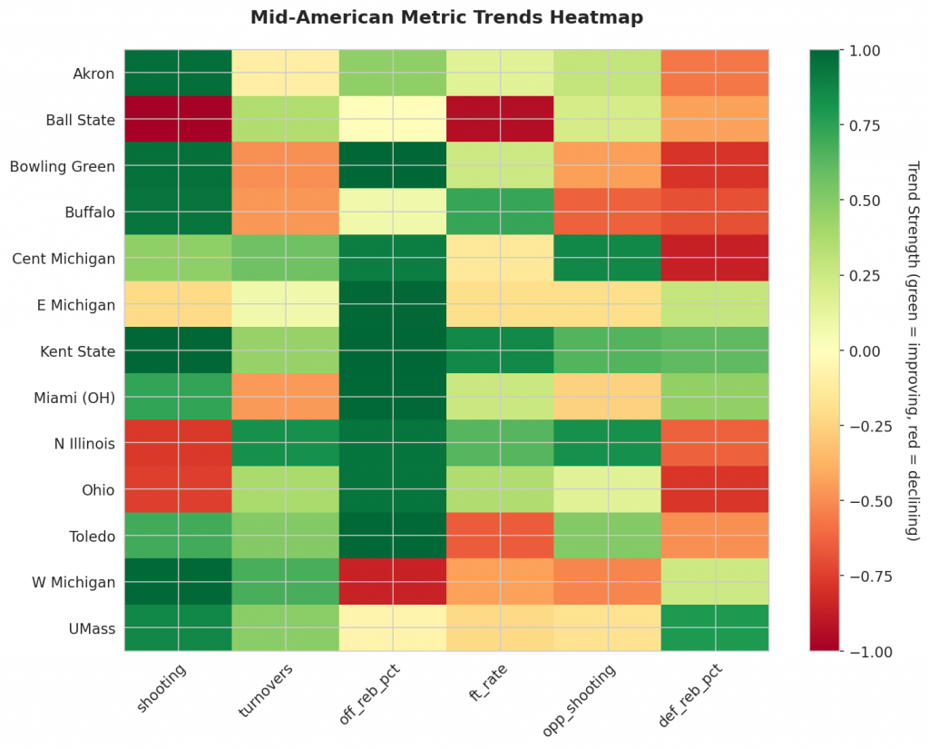 - Trending Down (Efficiency): Ball State, E Michigan, N Illinois, Ohio