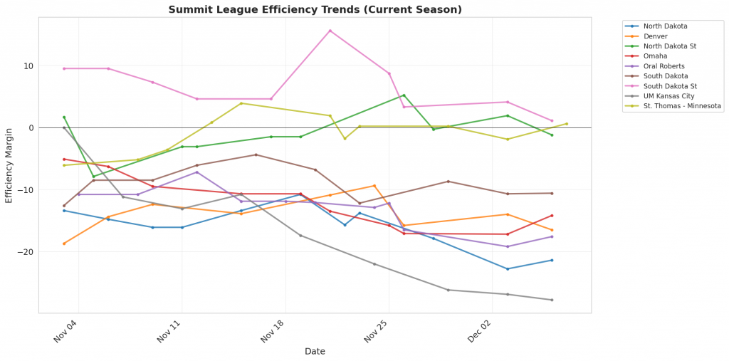 Figure 1: Efficiency margin trends for Summit League teams throughout the season. Teams trending upward show improving performance, while downward trends indicate struggles.