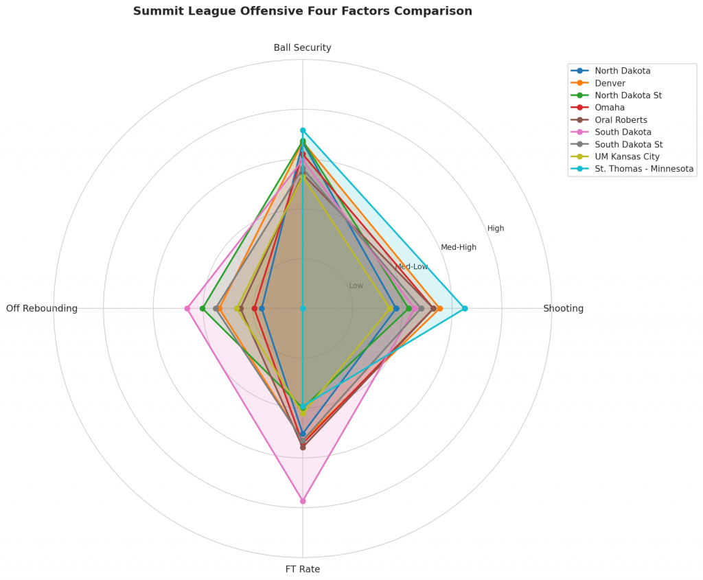 Figure 2: Offensive Four Factors comparison across Summit League teams. The radar chart shows each team’s shooting efficiency (eFG%), ball security (TOV%), offensive rebounding (OREB%), and free throw generation (FT Rate).