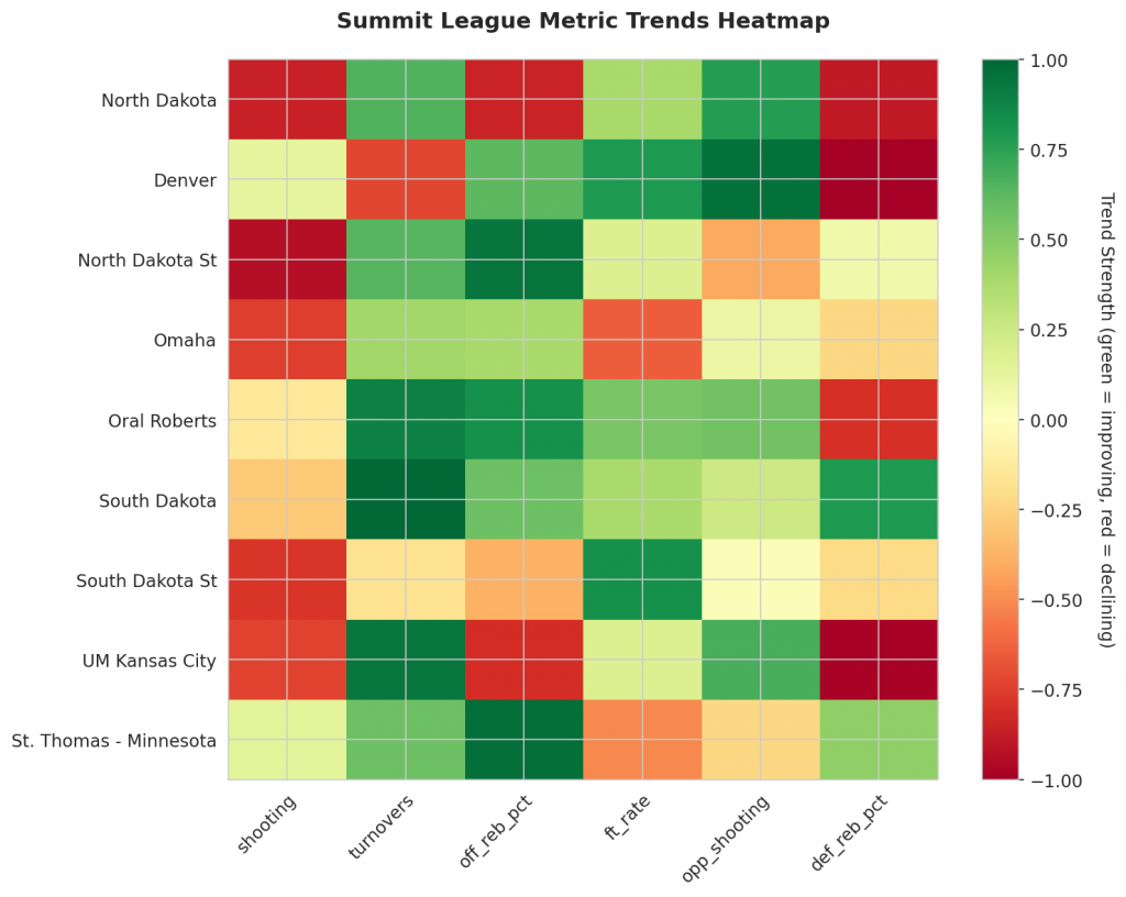 As Summit League teams continue their season, the MACD trending indicators will help identify which teams are genuinely improving versus those riding unsustainable momentum. Check back next week for updated analysis.
