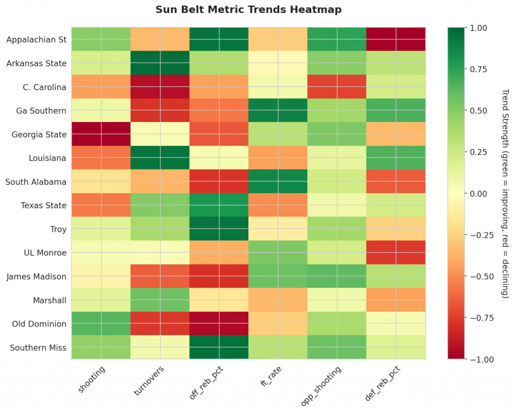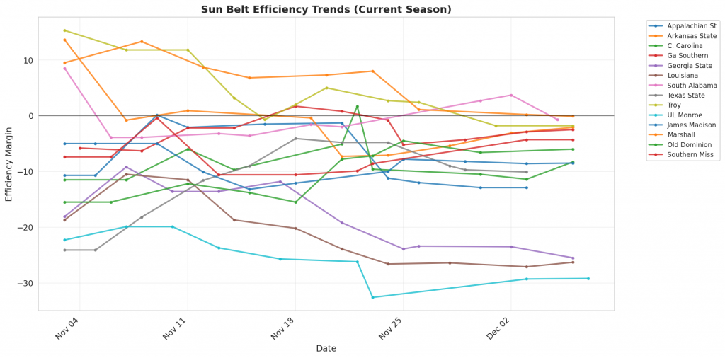 Figure 1: Efficiency margin trends for Sun Belt teams throughout the season. Teams trending upward show improving performance, while downward trends indicate struggles.