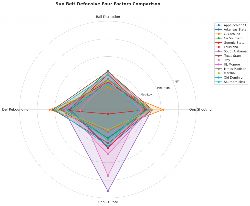 Figure 3: Defensive Four Factors comparison across Sun Belt teams. The radar chart shows each team’s opponent shooting defense (Opp eFG%), ball disruption (forcing TOV%), defensive rebounding (DREB%), and opponent free throw prevention (Opp FT Rate).